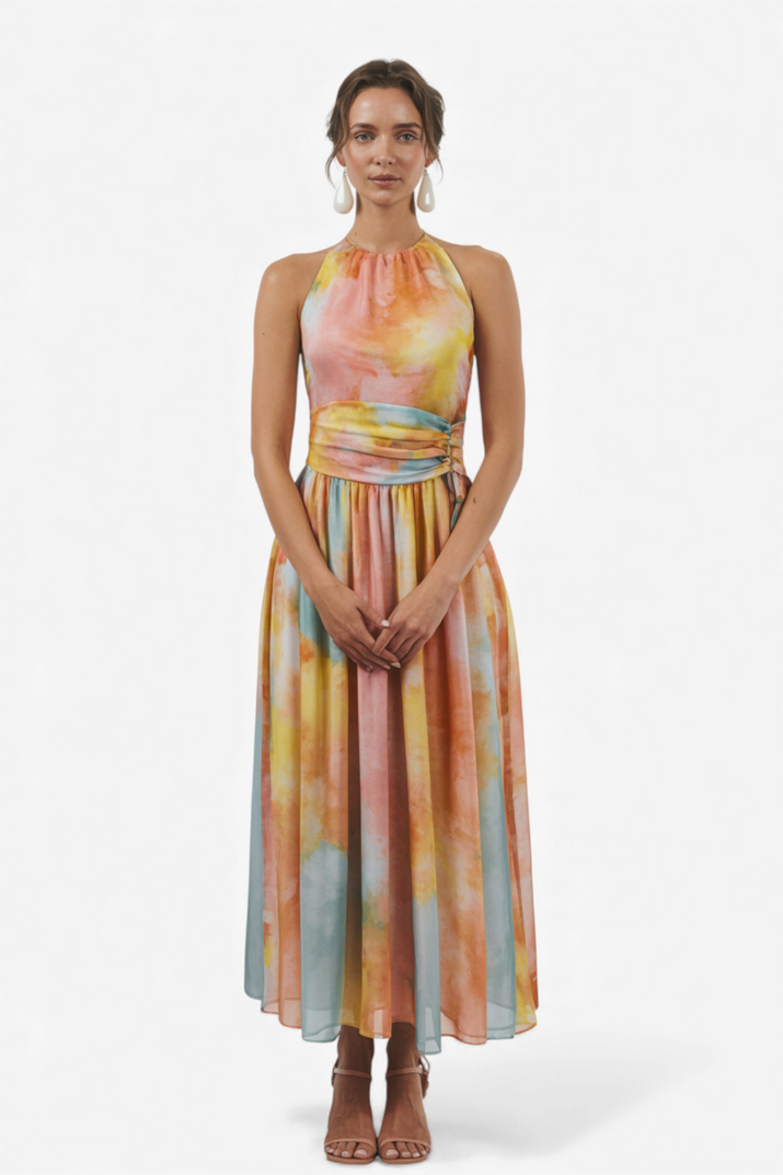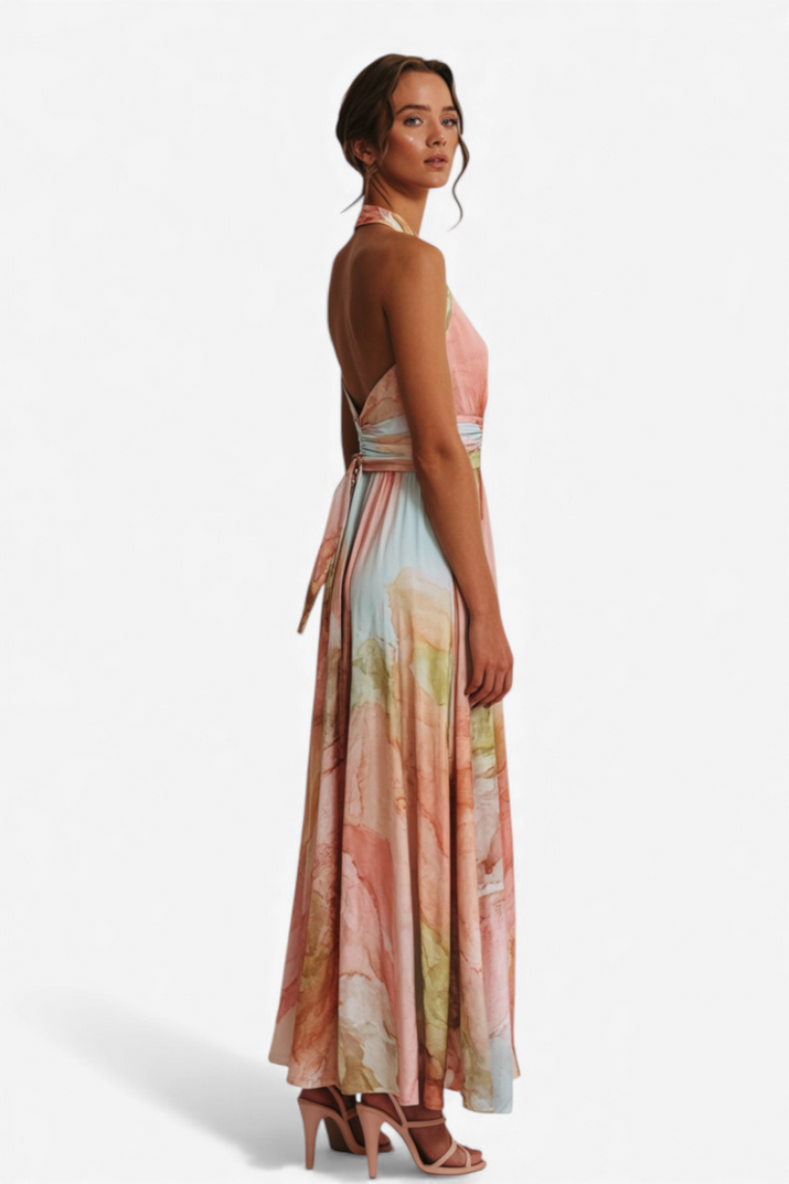 MAKSI OBLEKA Z AKVARELIM POTISKOM IN HALTER IZREZOM